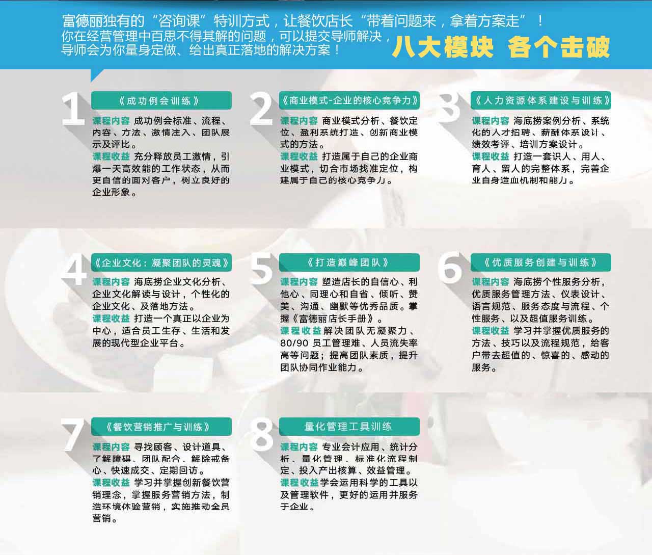 课程设置:茶、酒文化;菜系与烹饪知识;中西餐文化与禁忌;国际上通用宴请形式;开市与收市整理;接待服务基础;社交礼仪讲座;前台接待服务谈话技巧;门卫、行李员及接待员谈话技巧;让客人等候时谈话技巧;当问到自己不清楚事情时的谈话技巧;道歉时谈话技巧;称呼客人的技巧;员工电话服务技巧;酒店员工电话服务的基本要求;酒店员工电话服务的基本技巧;酒楼员工电话服务的规范用语;酒楼员工接受指示和报告情况的技巧(服从地接受指示、及时地报告情况)
